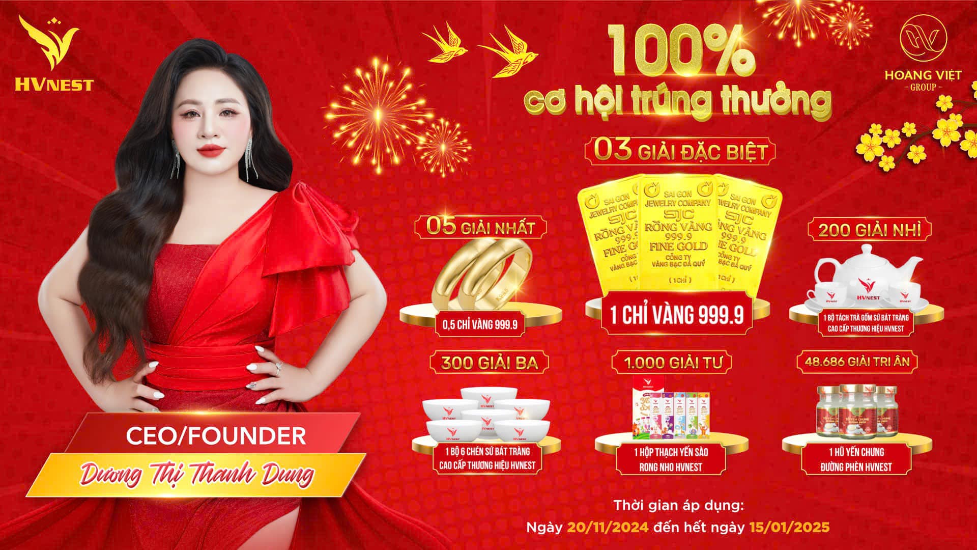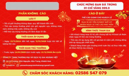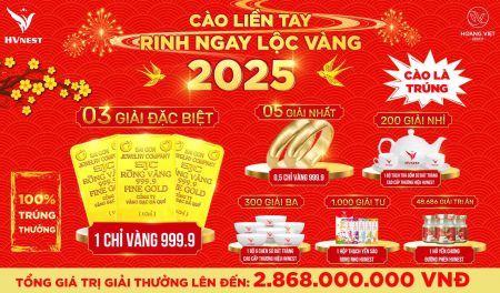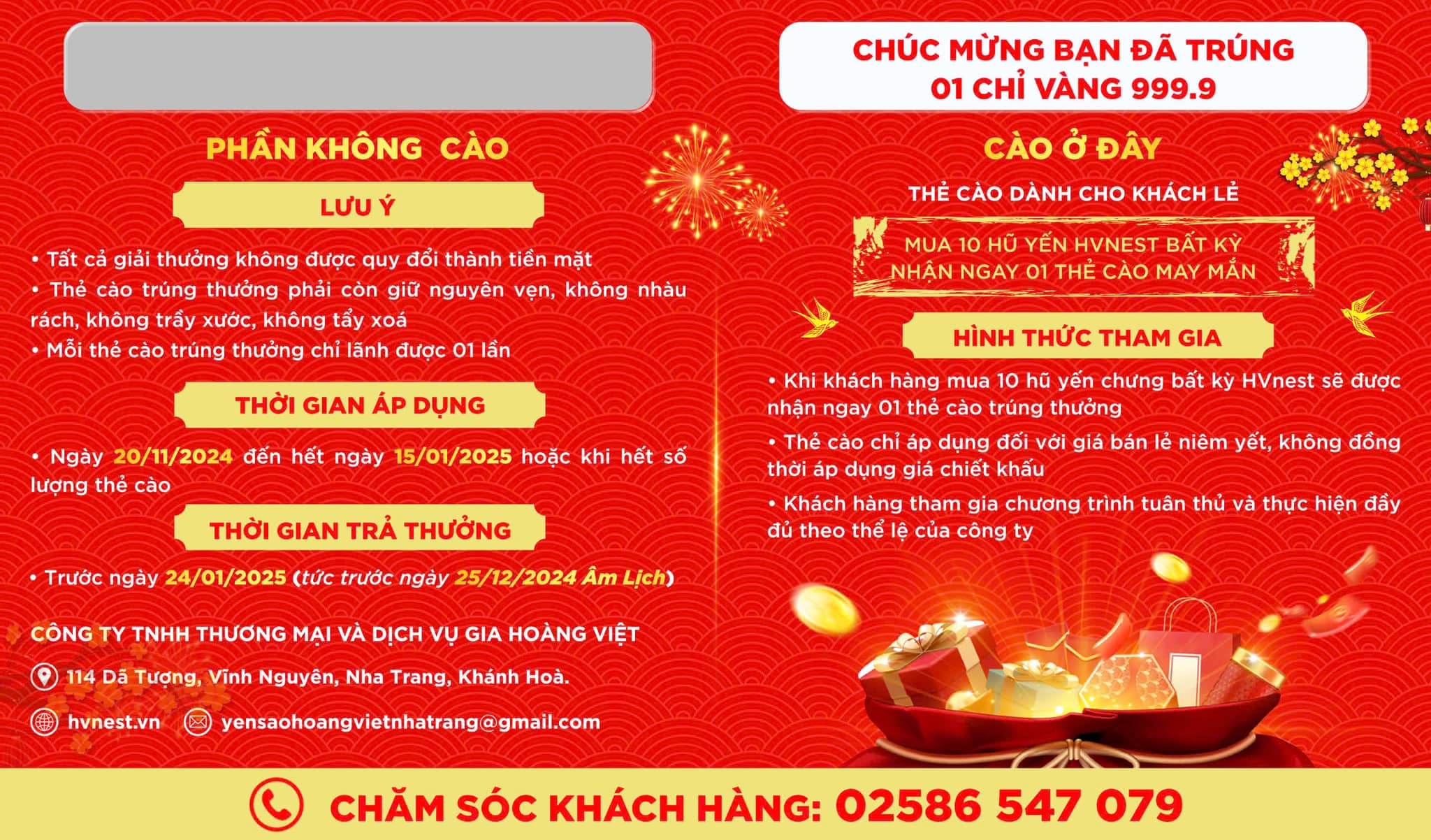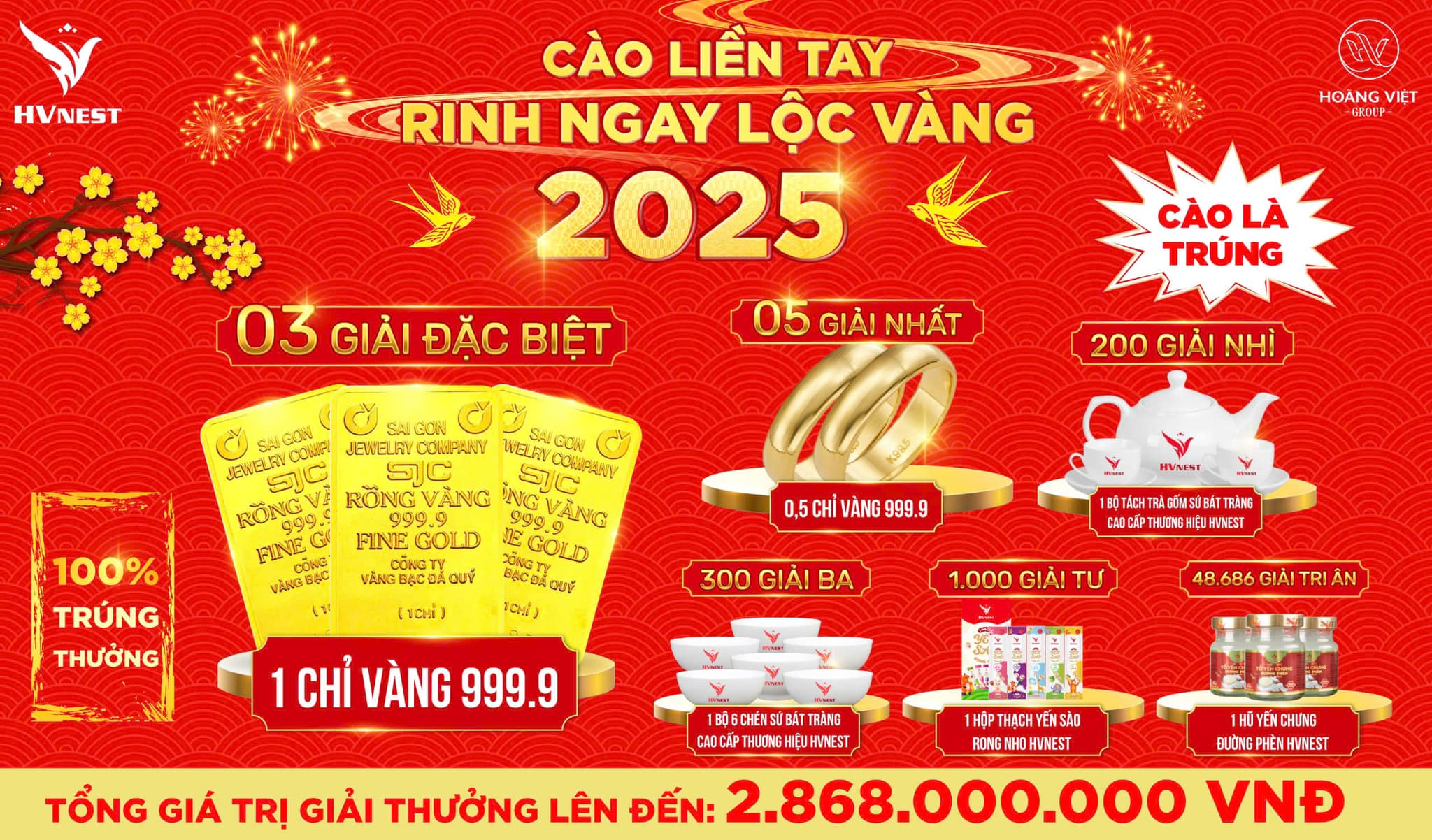 Chào đón Tết Nguyên Đán Ất Tỵ 2025, Công ty Yến Sào Hoàng Việt (HVnest) triển khai chương trình khuyến mãi đặc biệt “CÀO LIỀN TAY – RINH NGAY LỘC VÀNG”. Đây là lời tri ân sâu sắc dành cho Quý khách hàng đã tin tưởng và đồng hành cùng các sản phẩm chất lượng của HVnest trong suốt thời gian qua.