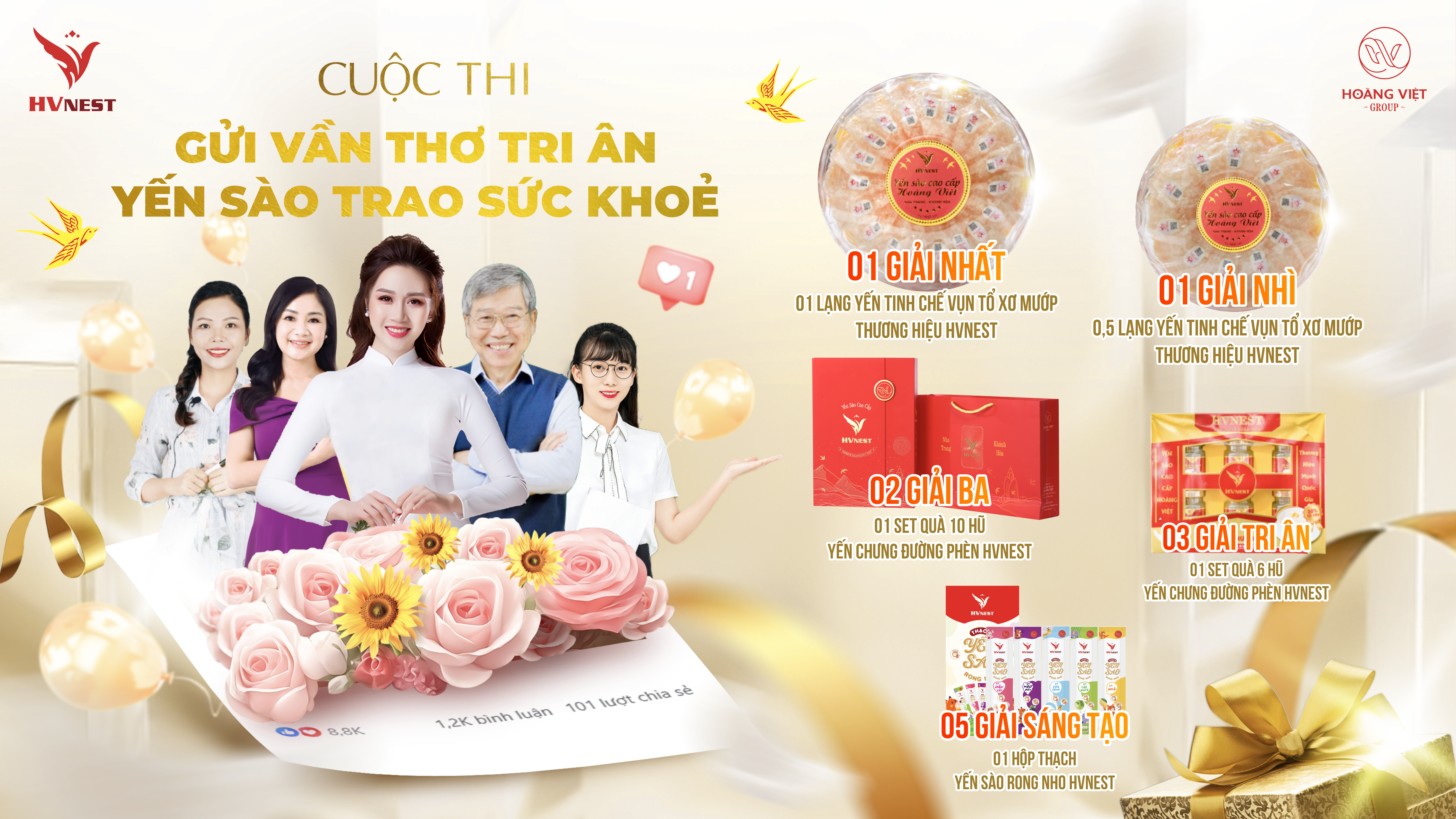 - Giải Sáng Tạo: 5 giải, mỗi giải gồm 1 hộp thạch yến sào rong nho HVnest